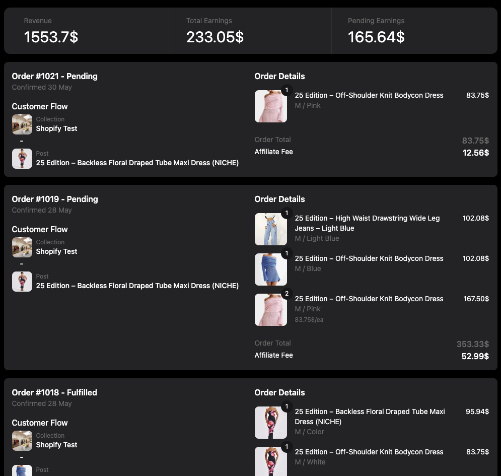Each collection has a unique link. Share it on Instagram, TikTok, or via text. When someone shops using your link, you earn a commission — no need to carry inventory or handle logistics.
